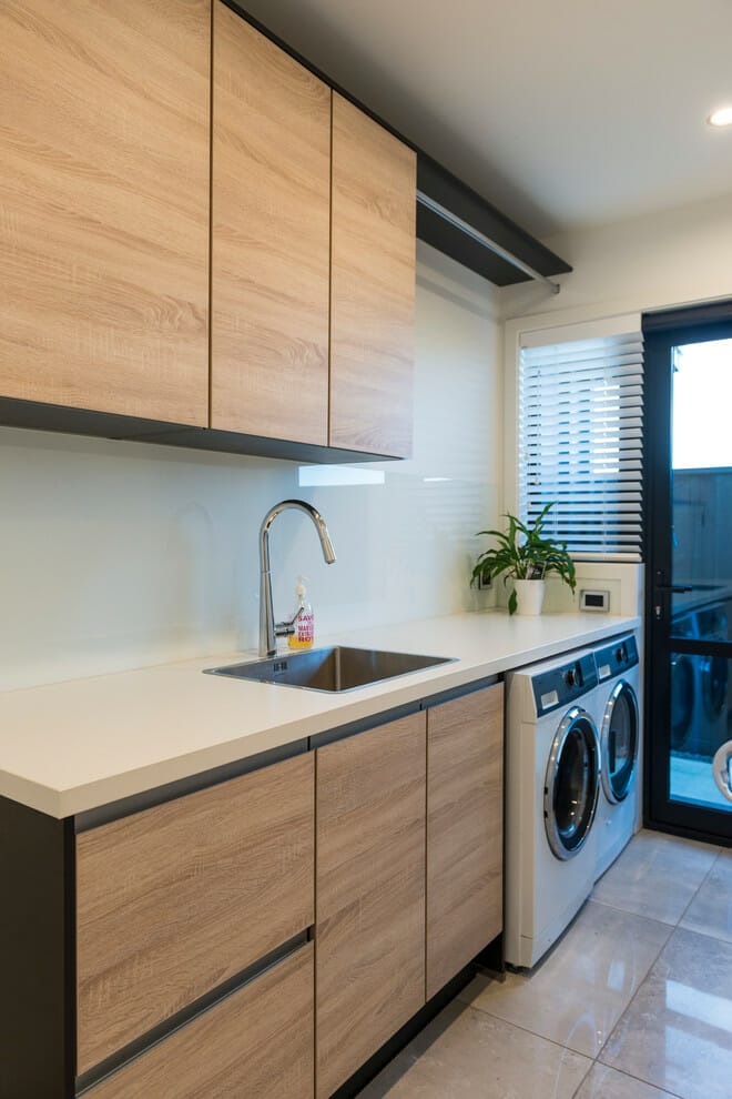 As you see, the black counter over the dryer and washer is smooth and functional. Meanwhile, the sink lets you get rid of stains on your clothes.