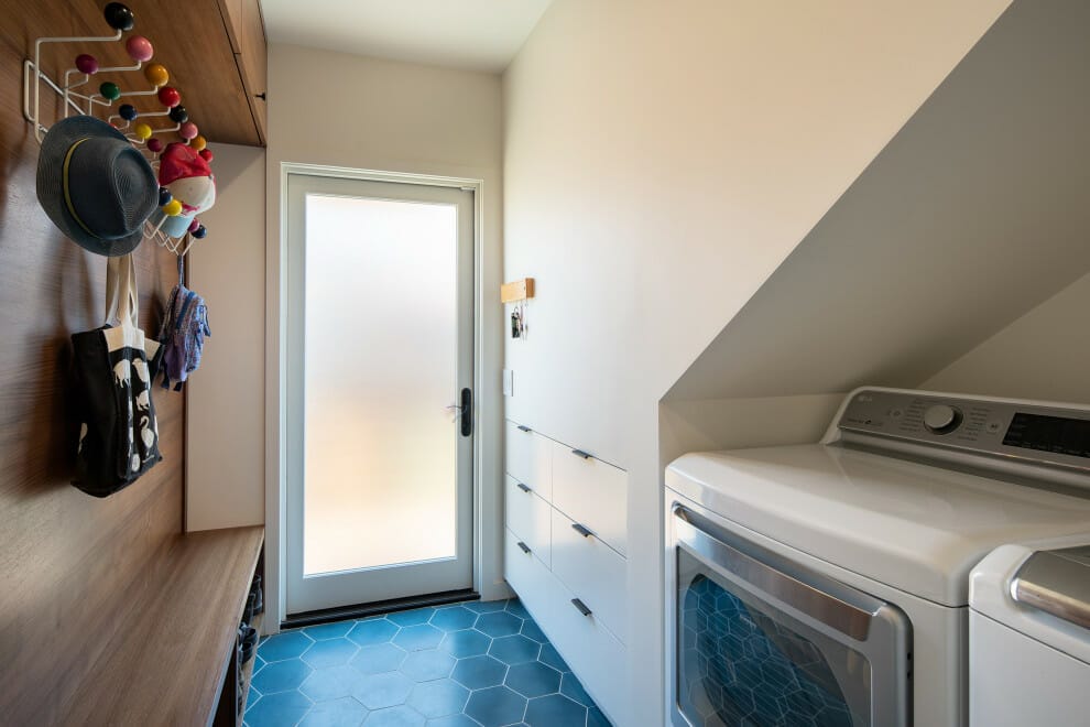 There is a frosted glass door that evokes airiness. In addition to letting the sunshine in, it balances out the deep gray hexagonal tiles of the mudroom-laundry room.