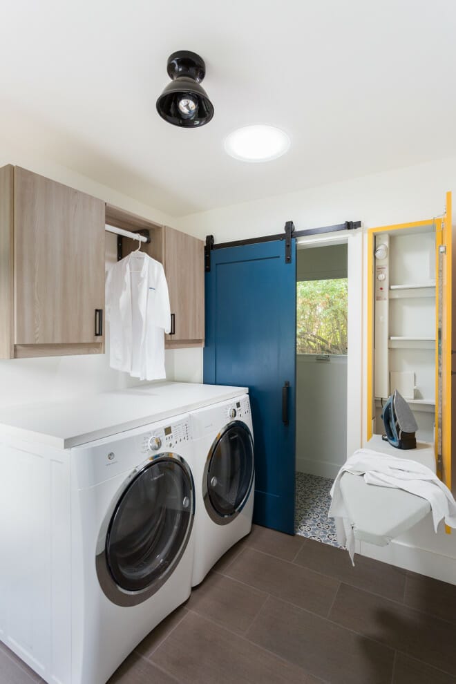 Need small laundry room door ideas? This idea undeniably comes in handy. The modern navy sliding door makes a statement in this laundry area.