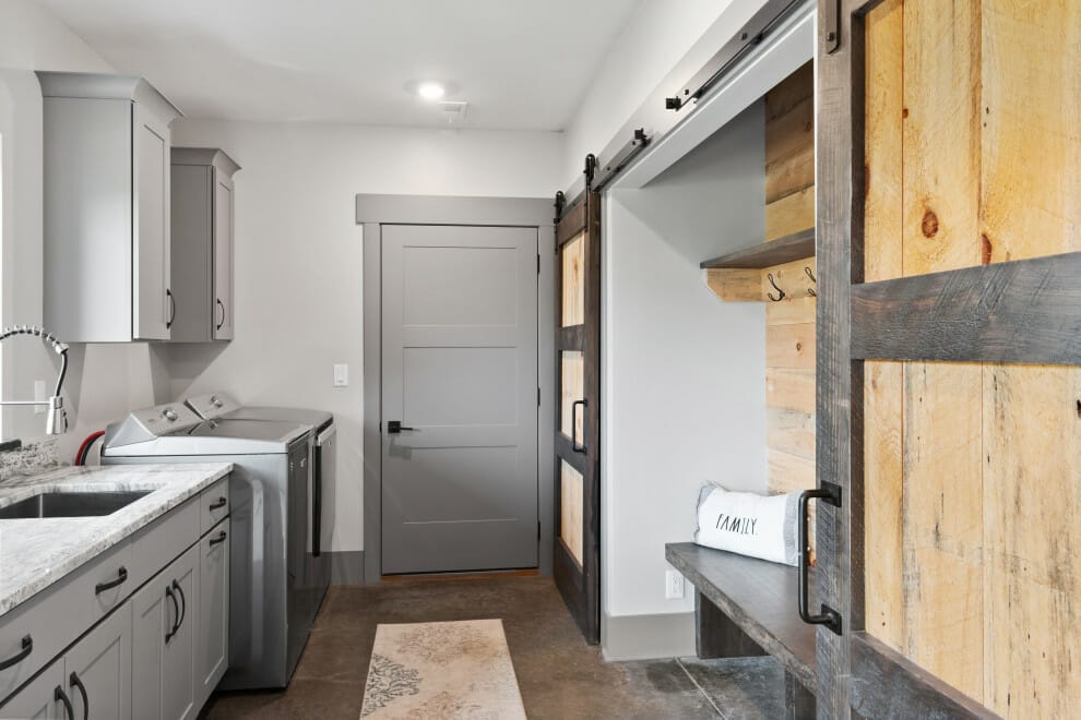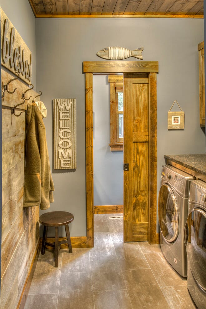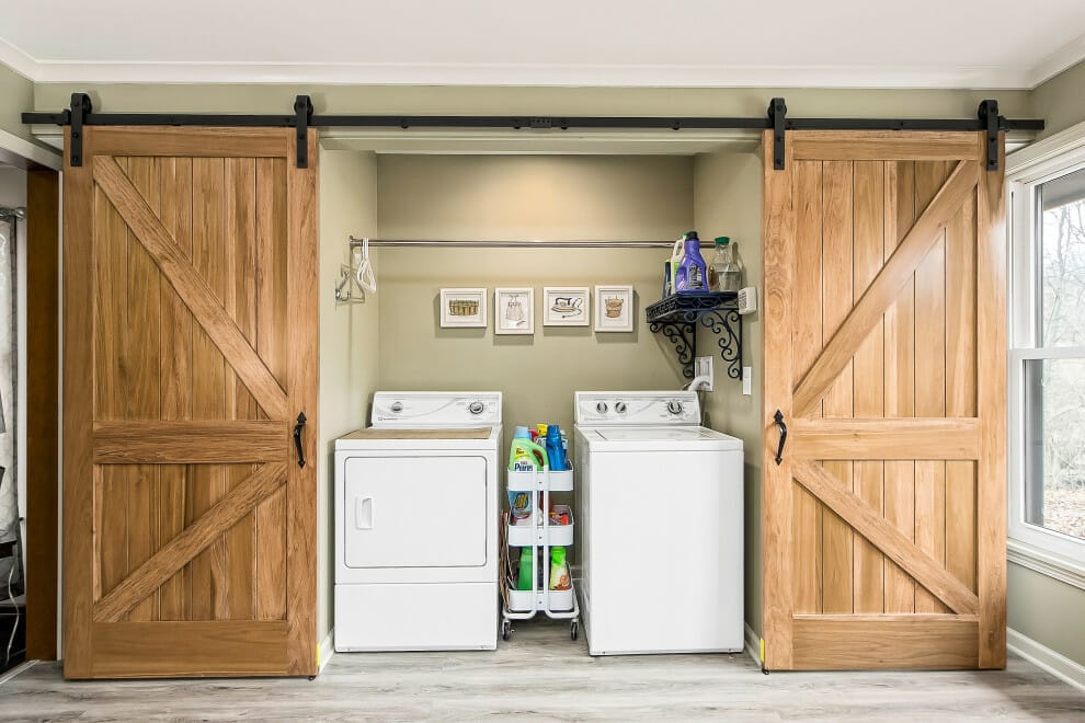 Rustic barn doors are perfect for laundry rooms in modern lodge homes. Here, the raw wood sliding door lets you enter and exit your laundry area without problems.