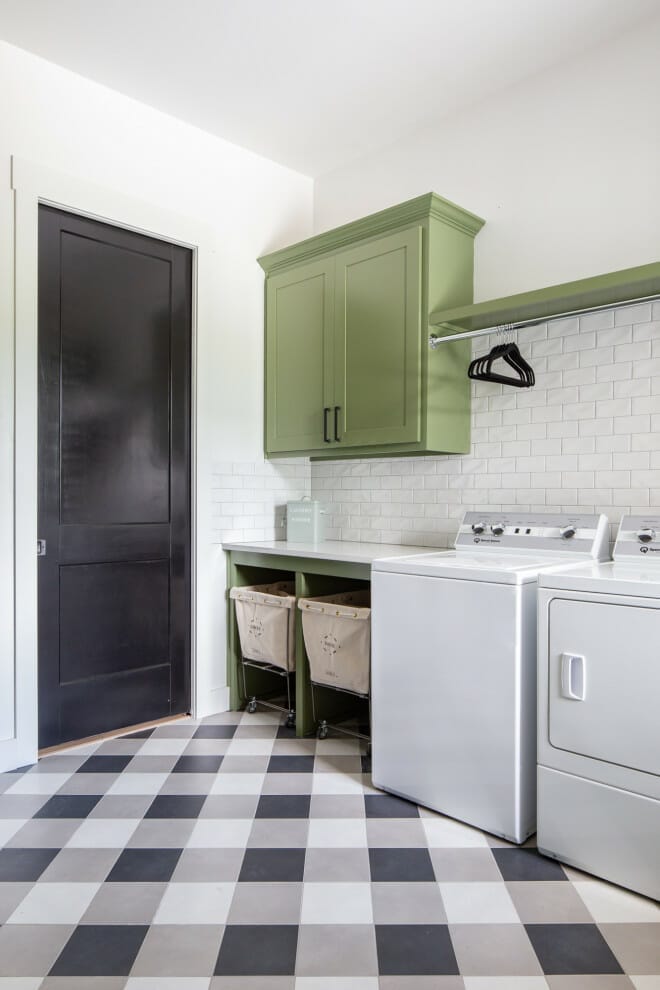 The black and gold furniture hardware pieces offer terrific accent colors. Meanwhile, the art and ornamental floor take the laundry room from basic to beautiful.