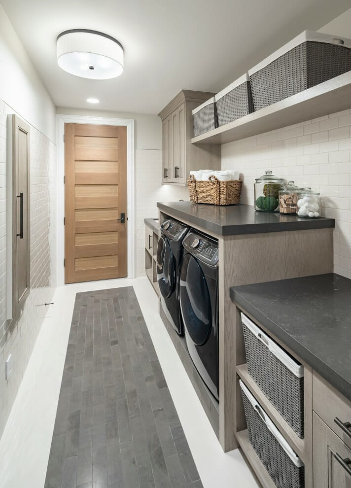Gray tiles, woven laundry baskets, front-loading machines, and counters keep the laundry area looking balanced.