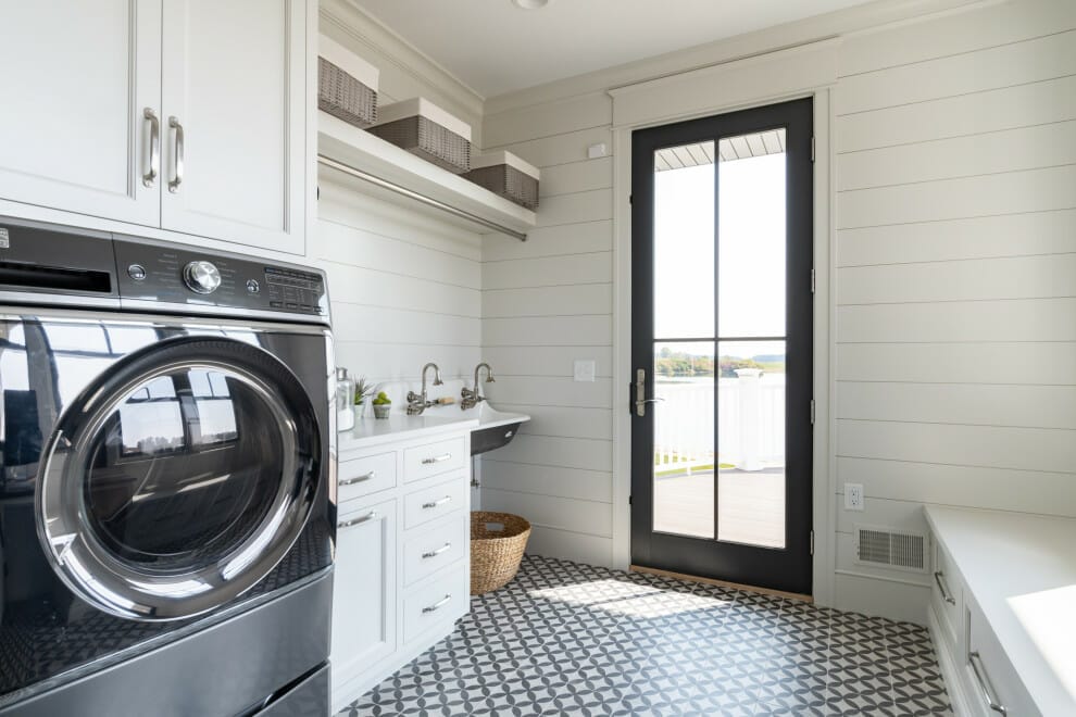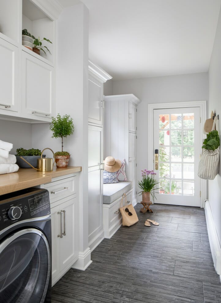 The homeowner included a laundry area in his mudroom. Bright white front-loading machines and walls open up the laundry room in no time.