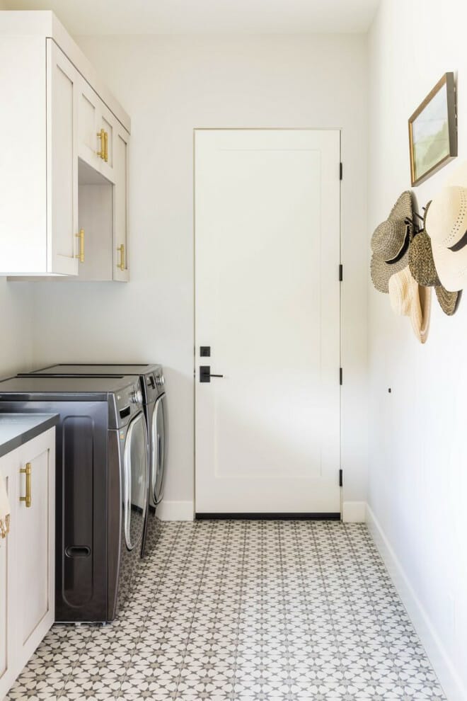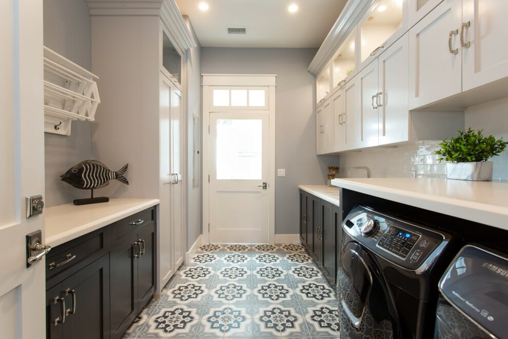 Black and white cabinets inject this galley laundry room with contemporary vibes. Underfoot are gorgeous tiles that pick up the interior’s main colors.