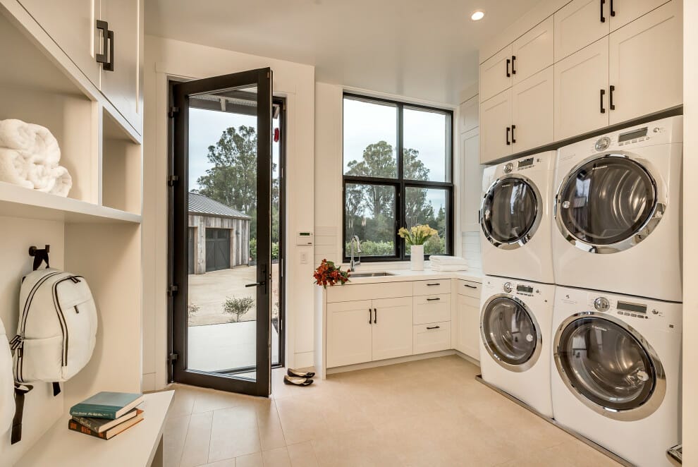 Here, the industrial door brings plenty of sunlight into the mudroom-laundry room. The dryers, washers, cabinets, and flowers make the laundry area luxurious.