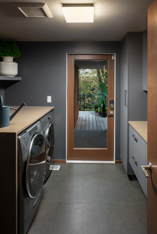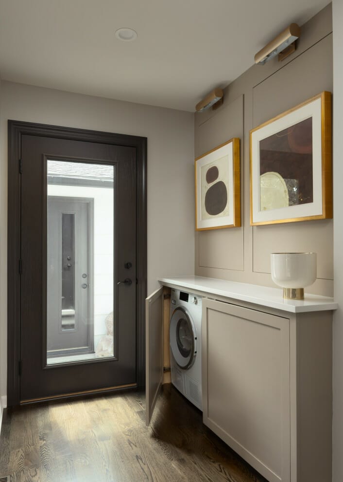 The deep gray glass door floods this windowless laundry area with plenty of daylight. It brings sophistication while creating enough drama.