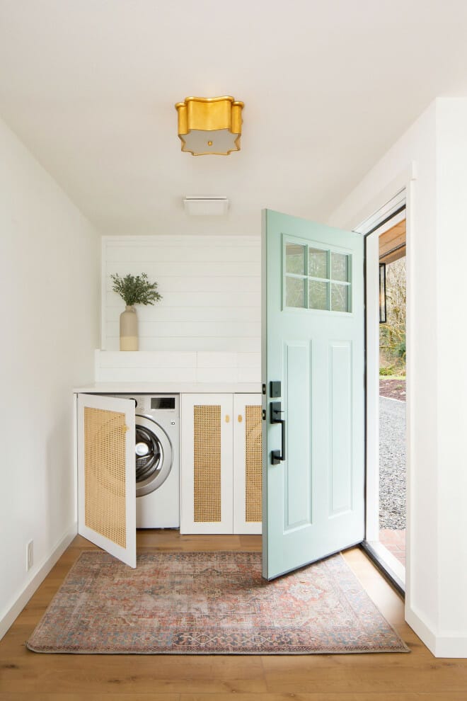 This single-panel white door is elegant. In addition, it boasts transparent glass panels for a tiny yet airy laundry room-mudroom.