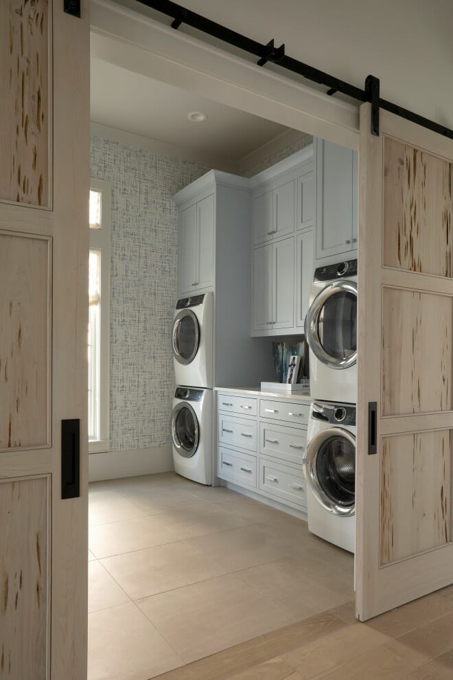 Here, the double barn door fits fabulously into the farmhouse laundry room. These sliding barn doors are not only space savers but also add function.