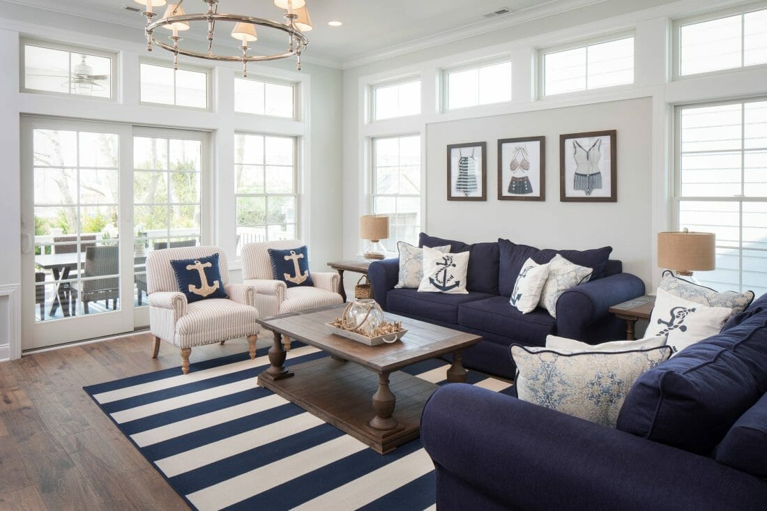 The unpainted wooden floor and tables evoke a nautical feel. Table decorations and anchor throw pillows become other nautical elements in this living room. Lastly, the striped rug and artworks exude cohesiveness.
