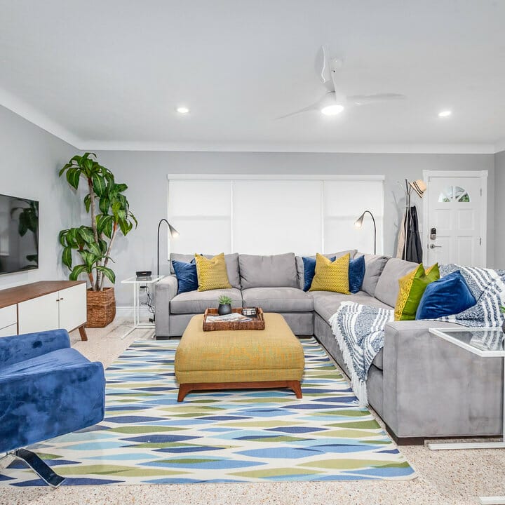 4. Gray Living Room Ideas with Blue and Yellow Accents