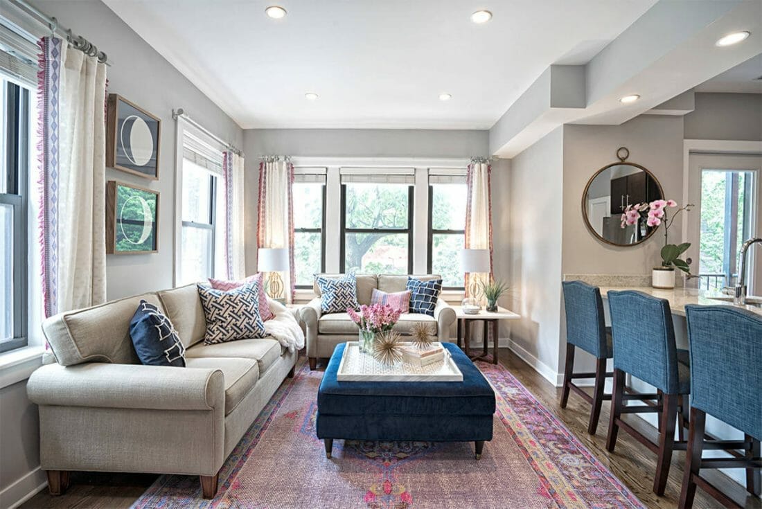 The navy blue ottoman table highlights the crisp white wooden tray. Furthermore, the pink accents via area rug, throw pillows, curtains, and flowers soften the palette. They balance out grays and blues well.