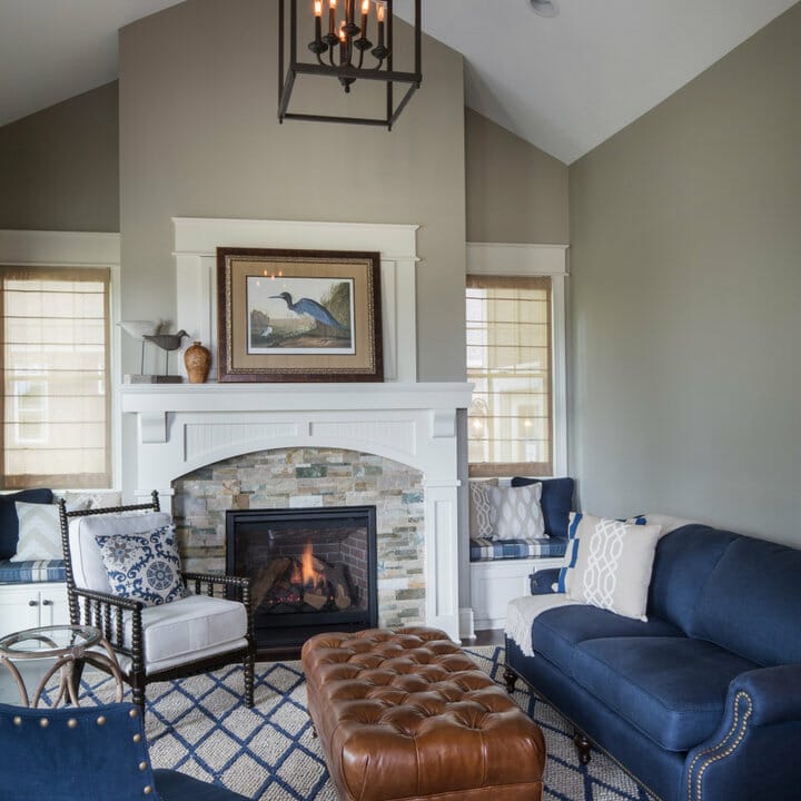 You love gray shades but don’t want a chilly-looking living room. If that’s the case, paint the walls warm-toned gray. Here, they let navy furniture pieces such as throw pillows, and seat cushions shine.