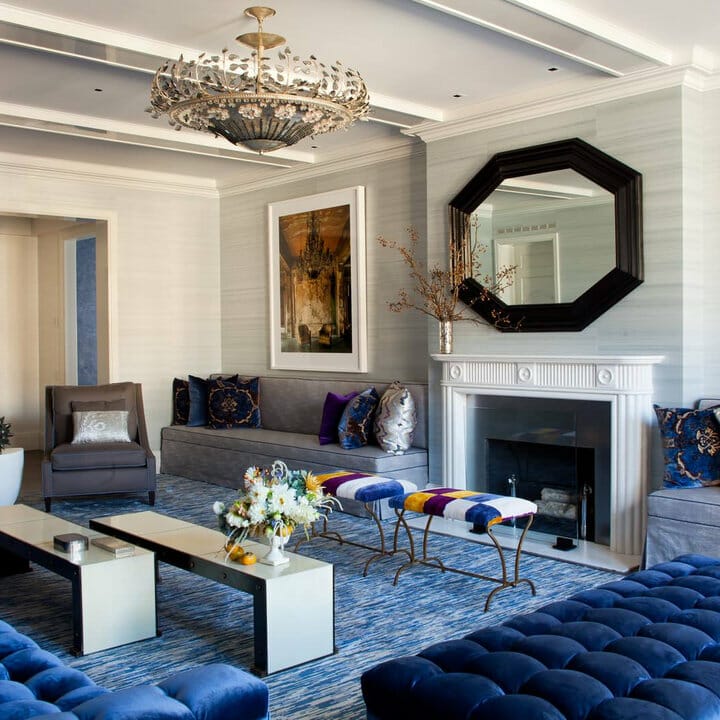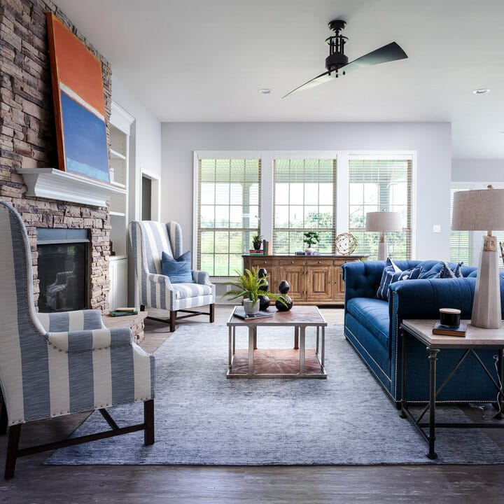 This living room embraces shades of gray on almost every surface. Additionally, the bold blue sofa and striped wingback chairs offer a lavish look.