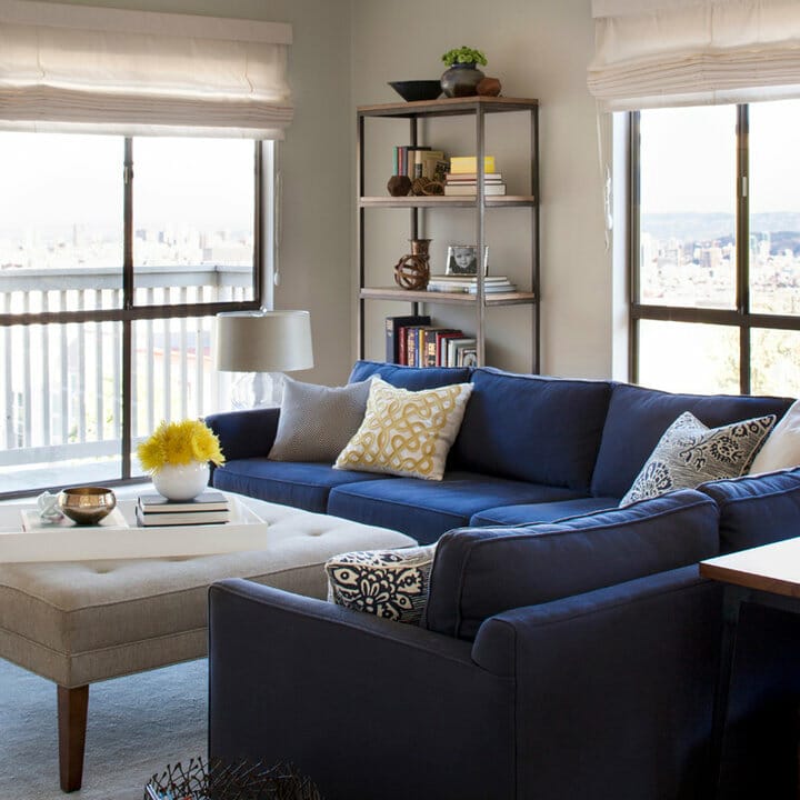 If you’re into a contrasting scheme, then go for it. This contemporary living, for example, looks captivating due to the navy sofa. Moreover, it makes neutral and patterned throw pillows more visible.