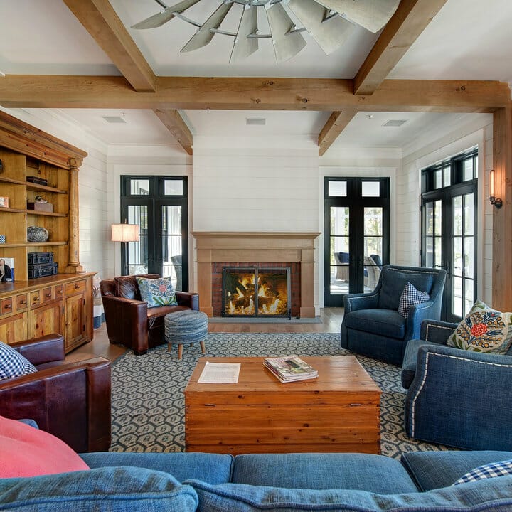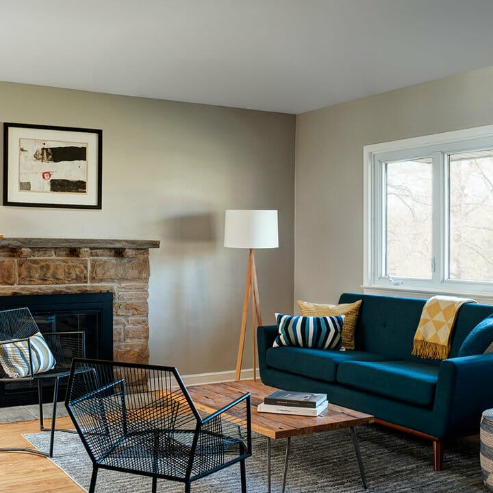 The black window frames and dark denim sofa chairs inject drama. They contrast with very light gray walls. Moreover, the wood floor and brick fireplace exude coziness. Meanwhile, the floral throw pillows complement the solid-colored furniture.