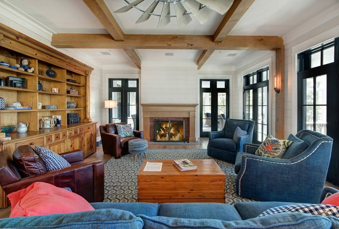Moreover, the denim blue furniture items keep the palette from looking basic. Furthermore, dark brown sofa chairs infuse added warmth and timeless luxury. They impart an elegant feel, too.