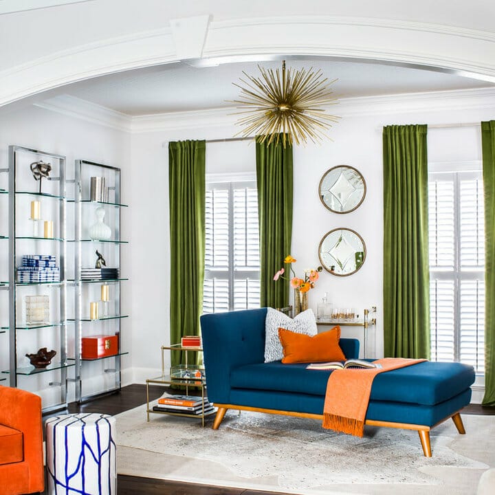 14. Blue and Gray Living Room Combination with Orange and Green Accents
