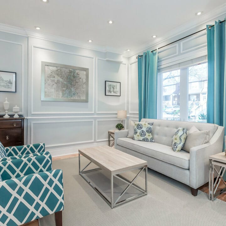 An easy way to have a two-tone living area is using furniture pieces. This modern living room, for example, boasts light gray sofas and vibrant blue armchairs. Furthermore, they generate a splendid contrast.