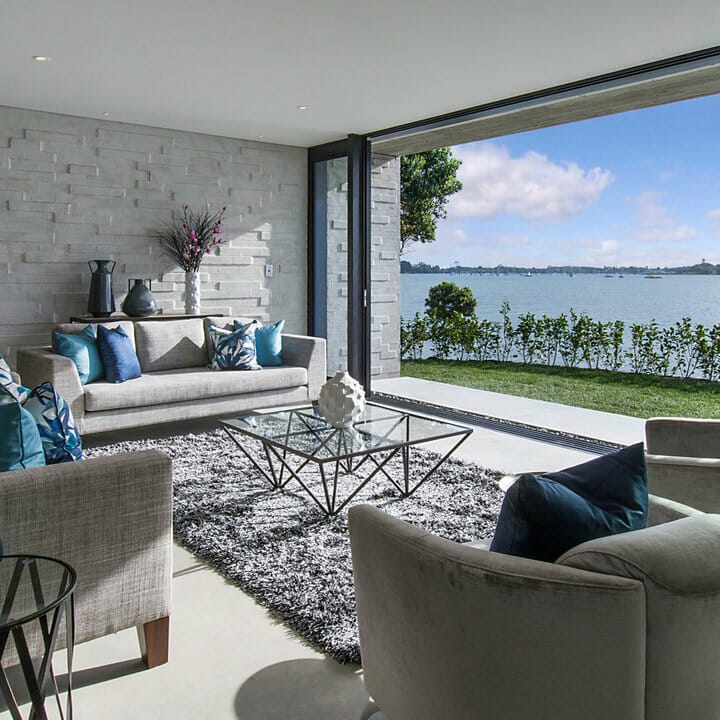 The bright Aegean blue sofa chairs perk the scheme up. Moreover, accents of wood and subdued orange balance out the cool grays and blues.