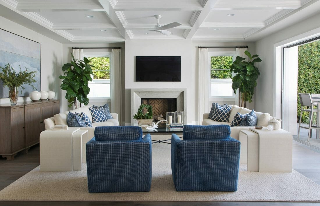 This cobalt blue and gray living room will steal your guests’ attention for certain. The very light gray ceiling and walls instill an airy vibe, while the bold blue furniture creates a statement.
