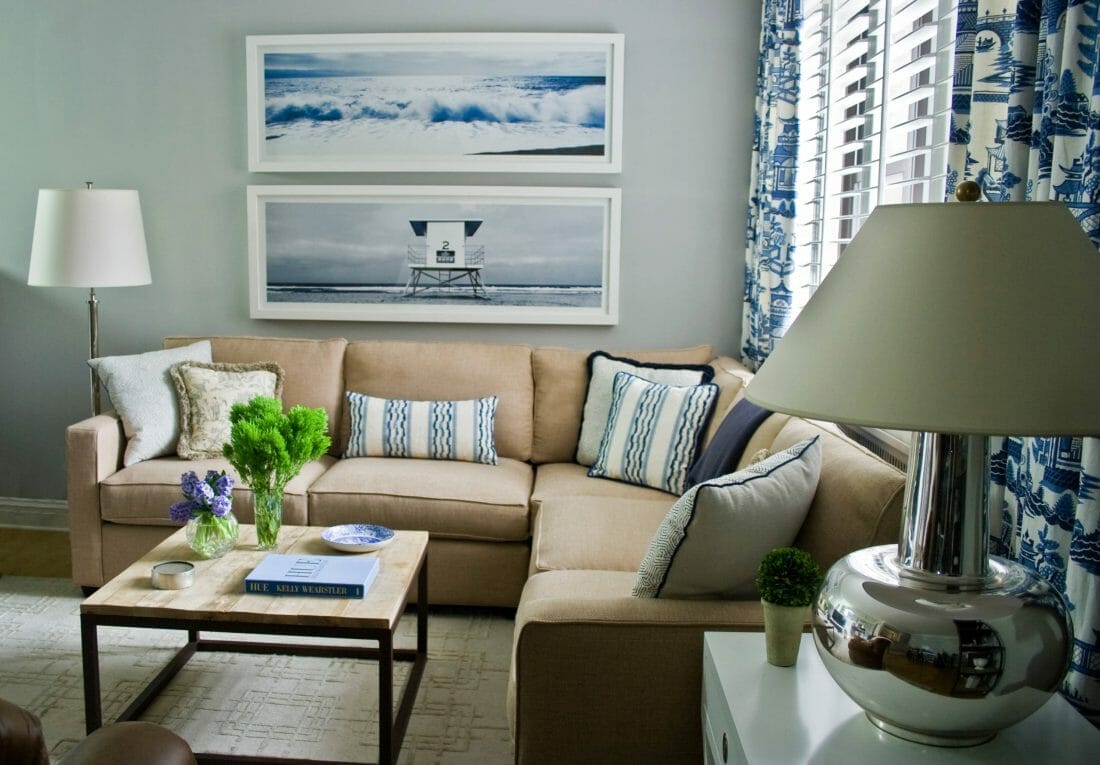 That cool gray backdrop and beige sofa create a subtle but stunning contrast. Furthermore, the silver accents offer a bit of glamor.