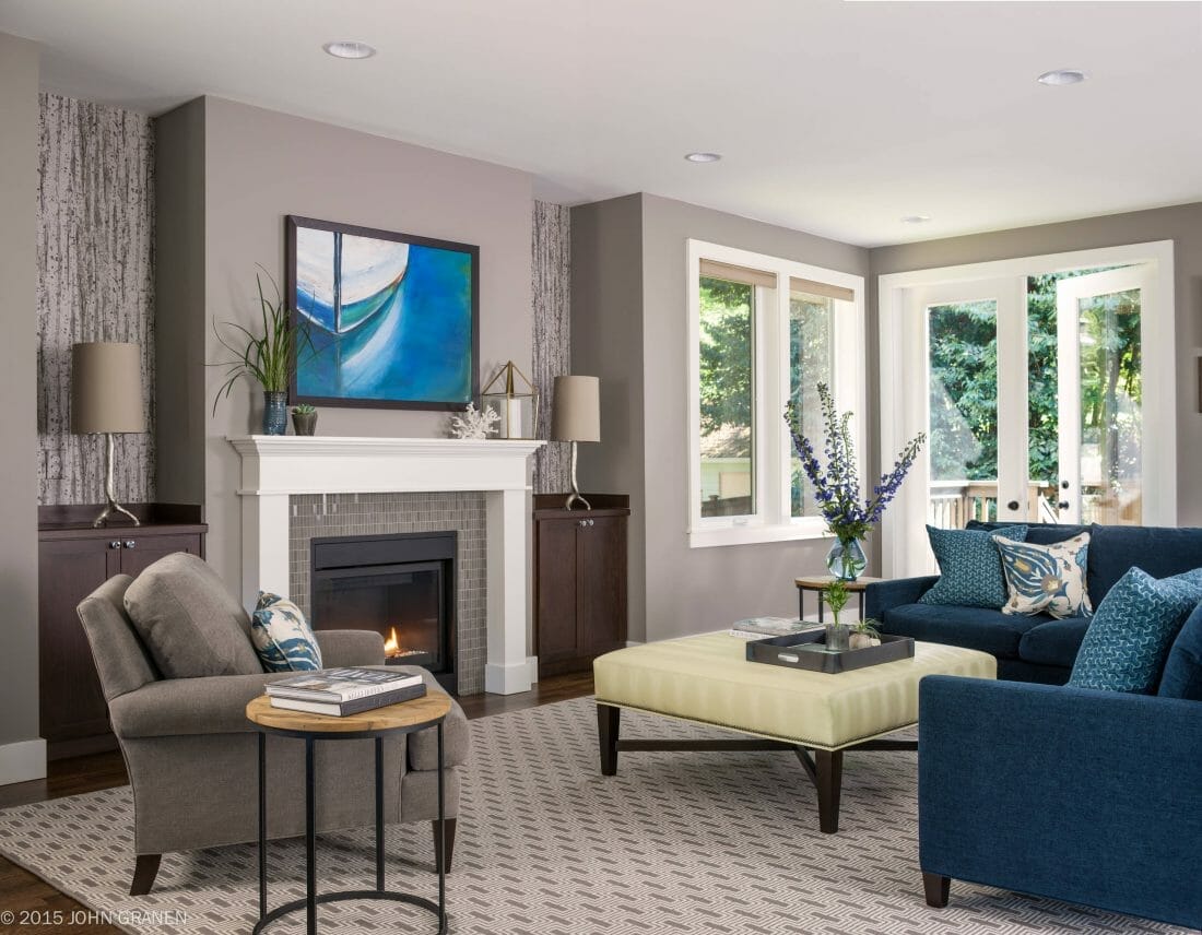 There are tons of impressive blue and gray living room combinations. This space employs warm gray walls that exude serenity and sophistication.