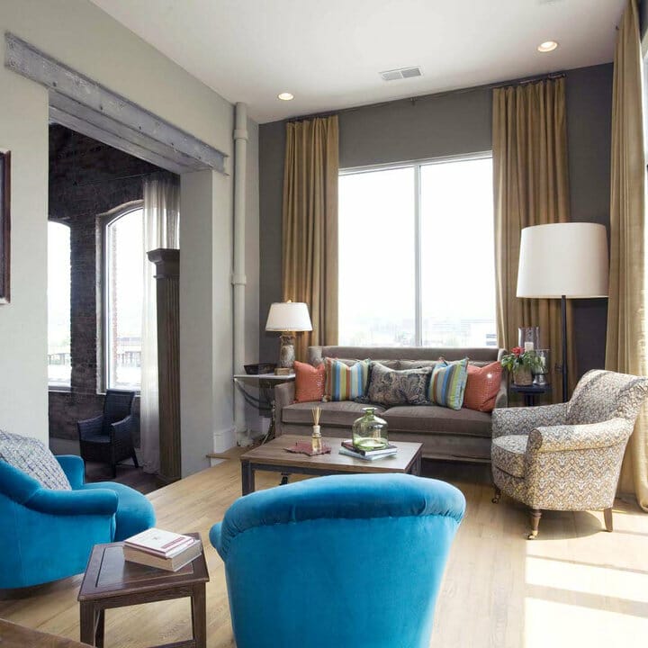 12. Gray Living Room with Blue and Dark Brown Furniture
