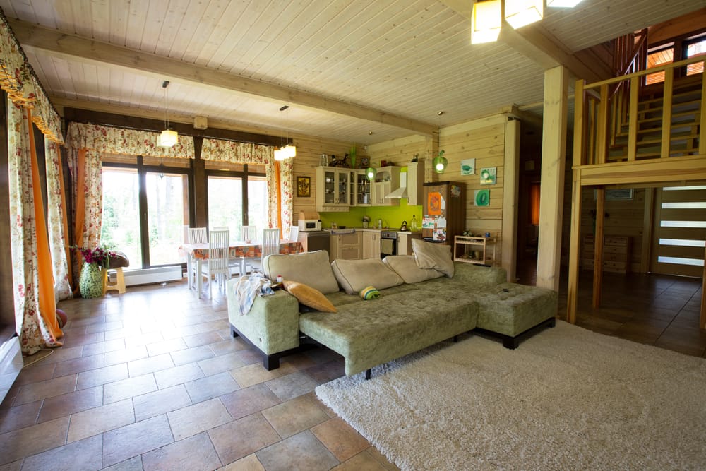 Sage green furniture set, white shag rug, and floral drapes are featured here. Unfinished ceiling, wall, and ceiling beams let original features of wood remain.