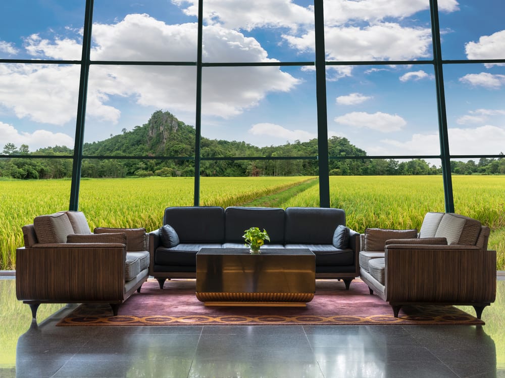 This sitting room definitely leaves me in awe. Floor-to-ceiling glass windows make the area well-lit and offer panoramic rice field views.