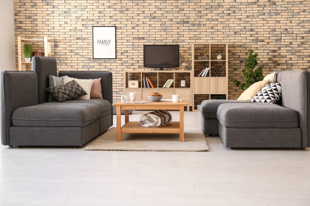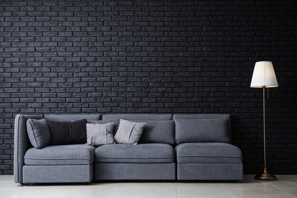 Dark brick wall and throw pillow give the room a natural drama. They pair awesomely with grey sofa and let floor lamp pop.