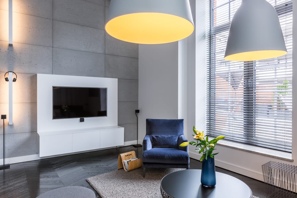 This lounge area is bright, serene, and utterly organized. White wall hanging, sofa chair, ceiling, and floor make the space feel larger than it is.