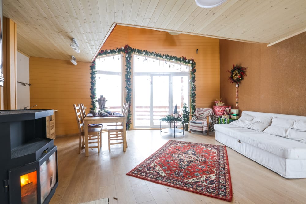 The fireplace is embellished with LED candles. Shabby chic area rug pampers your feet. Incredible!