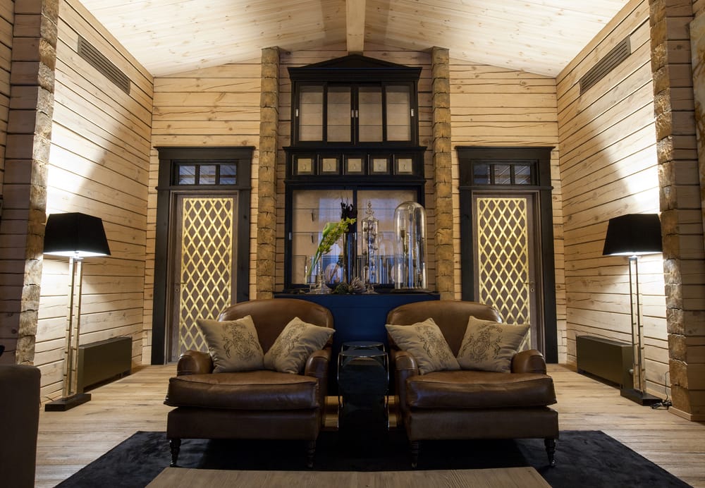 Unfinished wooden ceiling, floor, beams, and walls expose nature’s rawness. Brown velvet couch and area rug offer ultimate comfort. Leather sofa chairs and deer hide cube stool generate an untamed look.