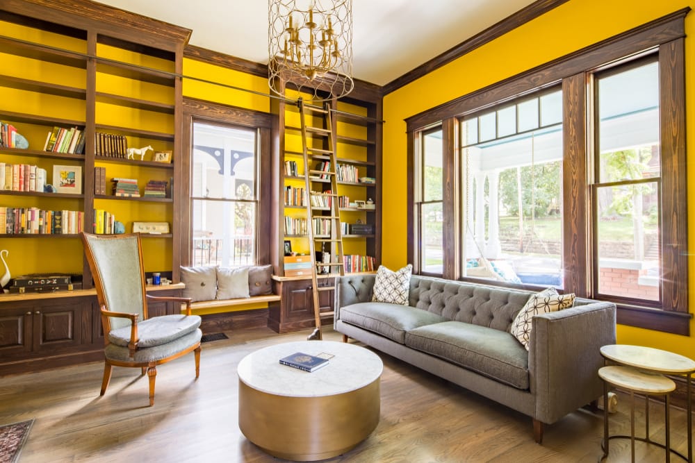 The homeowner expertly paired muted sofa and tufted couch with bright walls. They create a captivating color balance. Patterned throw pillows quickly catch the attention. Glass windows keep the area sunny and airy.