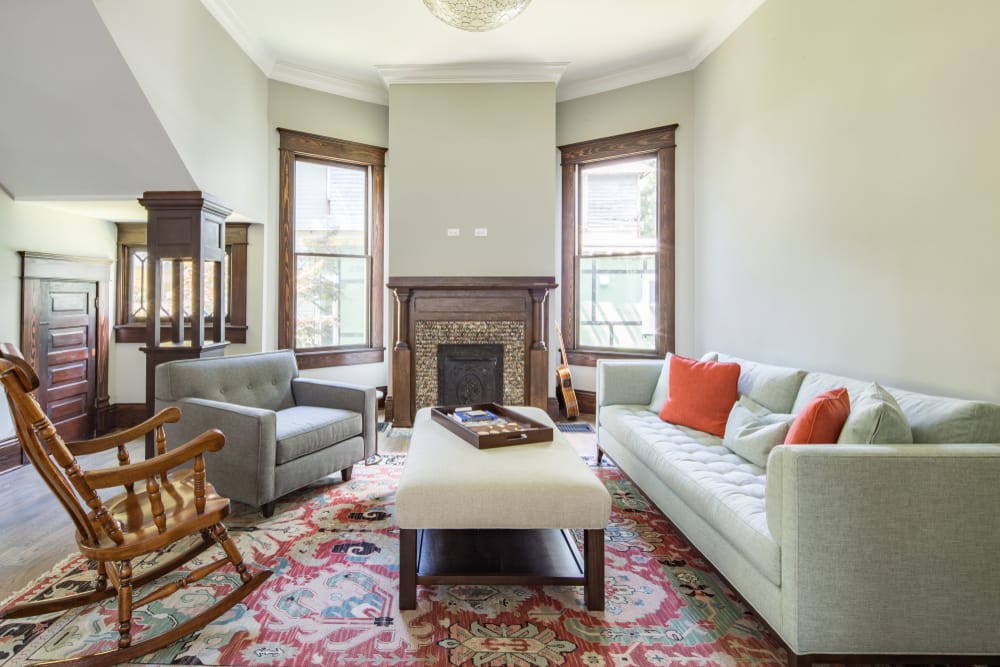 Underfoot is a vintage Turkish area rug. It offers old-world charm and injects bursts of colors. Meanwhile, wooden rocking chair, coffee table, fireplace mantel, door, and frames of the windows produce a cohesive look.