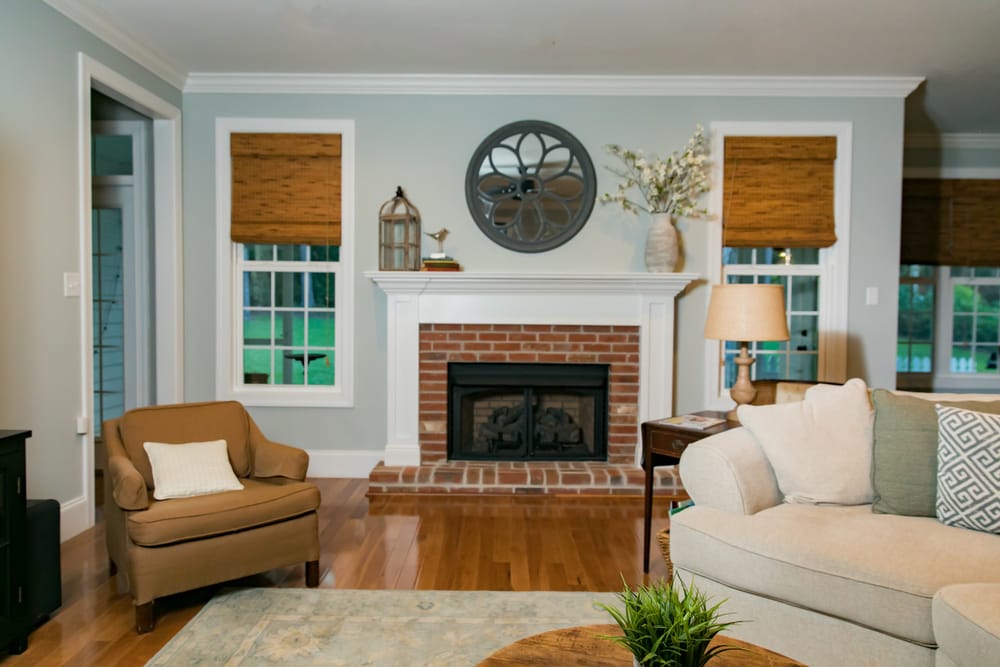 Brick fireplace, wood floor, coffee table, and window blinds bring the outside in. A white throw pillow is placed on brown sofa chair to unify the room. Dried cotton flowers and greenery adorn the space.