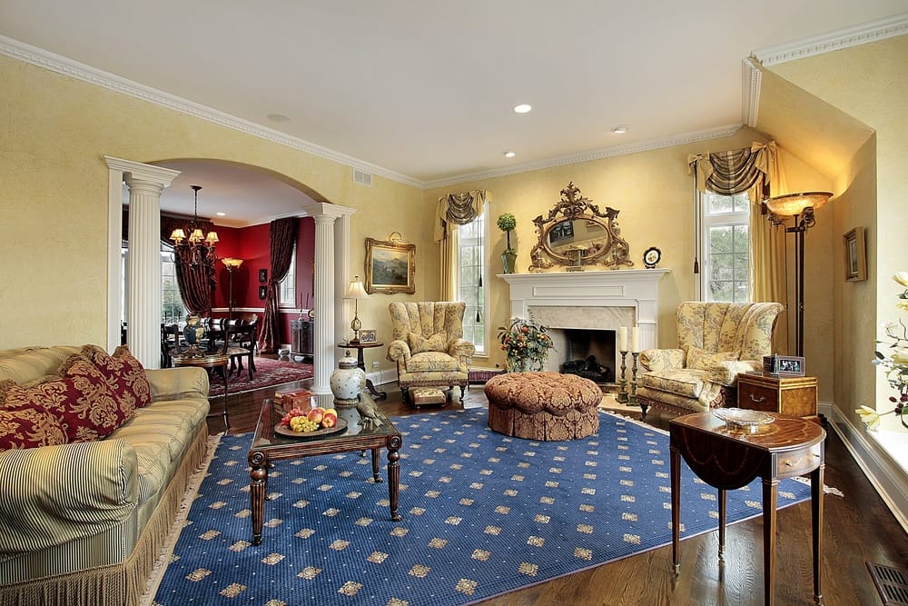A pair of white pillars reflects the room’s magnificence. Blue area rug, patterned red throw pillows, and flowers complete the formal lounge.