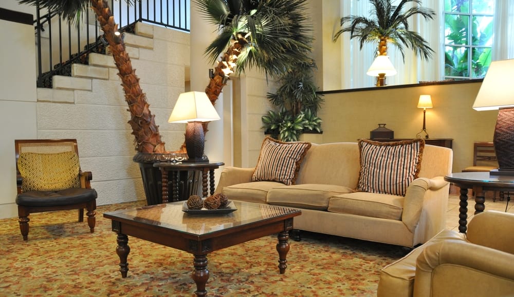 Floor lamps cast a soft glow during evening hours. To decorate the lounge, place potted artificial date palm trees around the seating. They add a touch of nature to your indoor area.