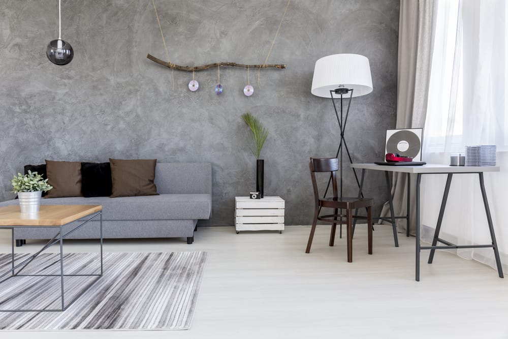 Here, stripped area rug is the focal point. Coffee table, floor lamp, minimalist desk, and galvanized metal vase offer an industrial edge. Plant and flowers revive the room.