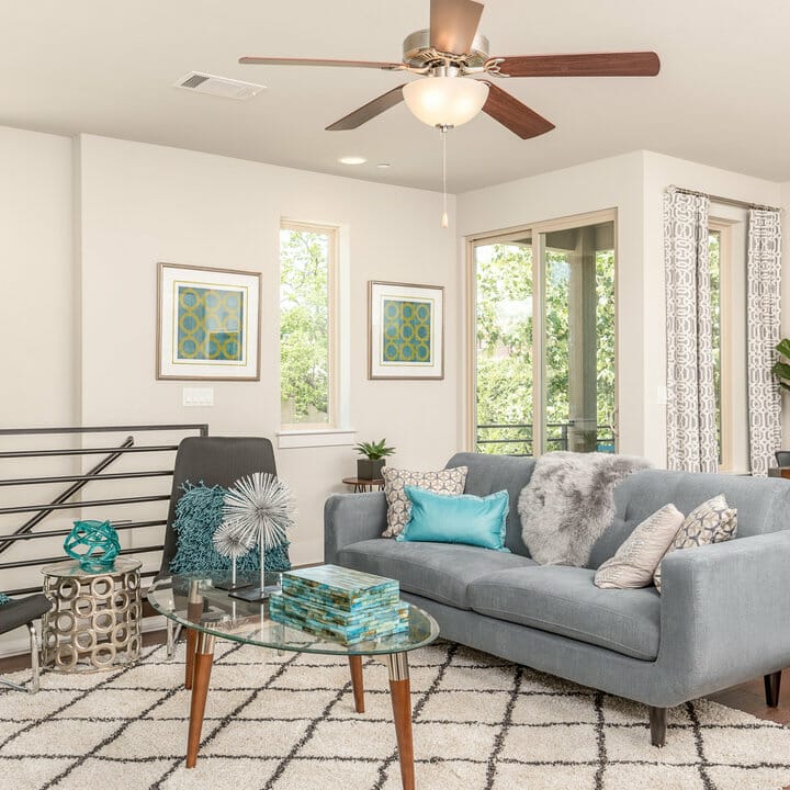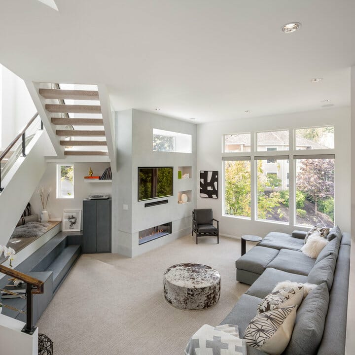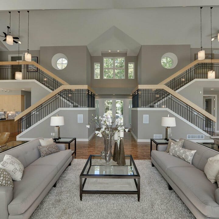 The wooden floor accentuates warm gray couches and conveys serious warmth. Moreover, decorative pillows deliver dimension, outstanding patterns, and additional shades of gray. Glass doors, stairs, and windows lend this two-story abode visual symmetry.