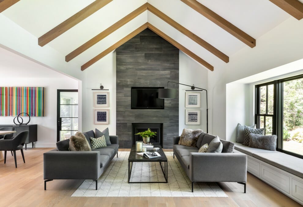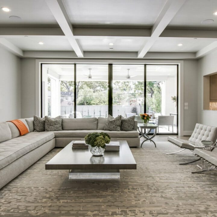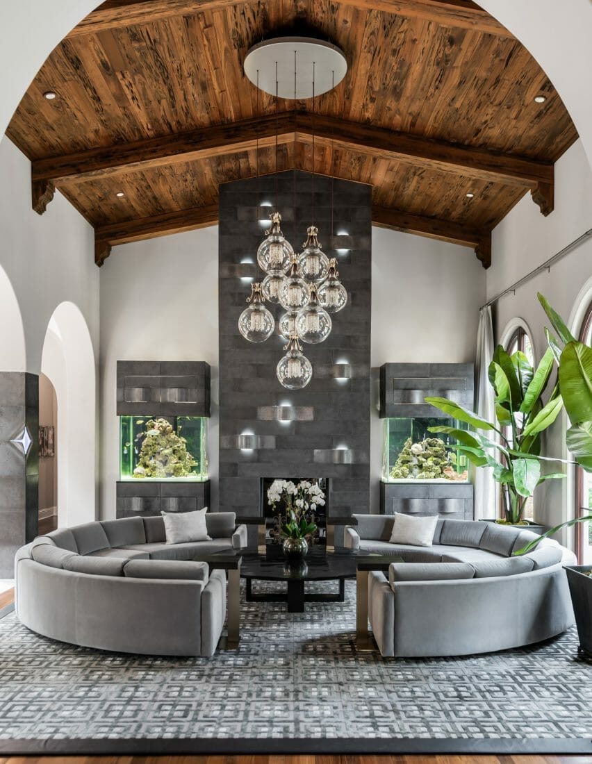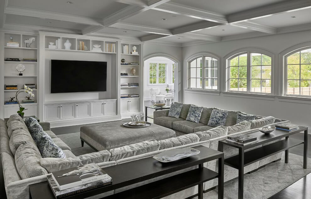The sectional, coffered ceiling, coffee table, and tufted chairs give splashes of light gray. Apart from portraying subtle sophistication, they retain the room’s tranquility.