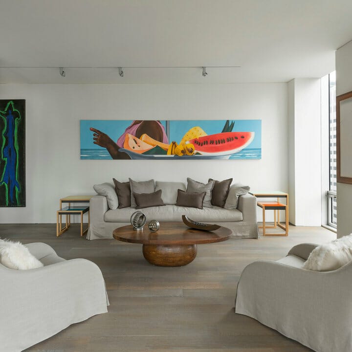 The round table accentuates embellishments of silver and warm gray shades. Meanwhile, mismatched pale wood end tables and oversized artworks bring punchy bursts of color.