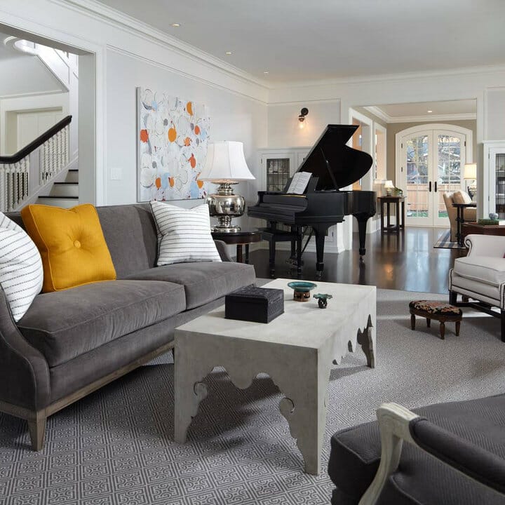 The dark gray storage box and piano infuse the open-concept living room with enough drama. Furthermore, the pale gray wall showcases a head-turning artwork with cool and warm hues.