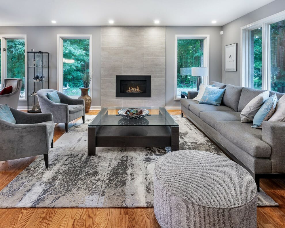 The abstract rug, center table, round ottoman, walls, and fireplace tiles supply additional grays while adding dimension. Natural wood and rich red tones deliver lots of warmth.
