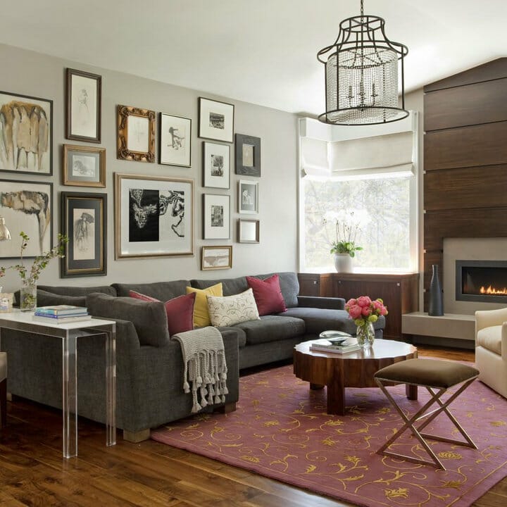 Here, the gallery wall lends the gray sectional an artistic backdrop. Additionally, varying finishes of artwork frames convey eclecticism.