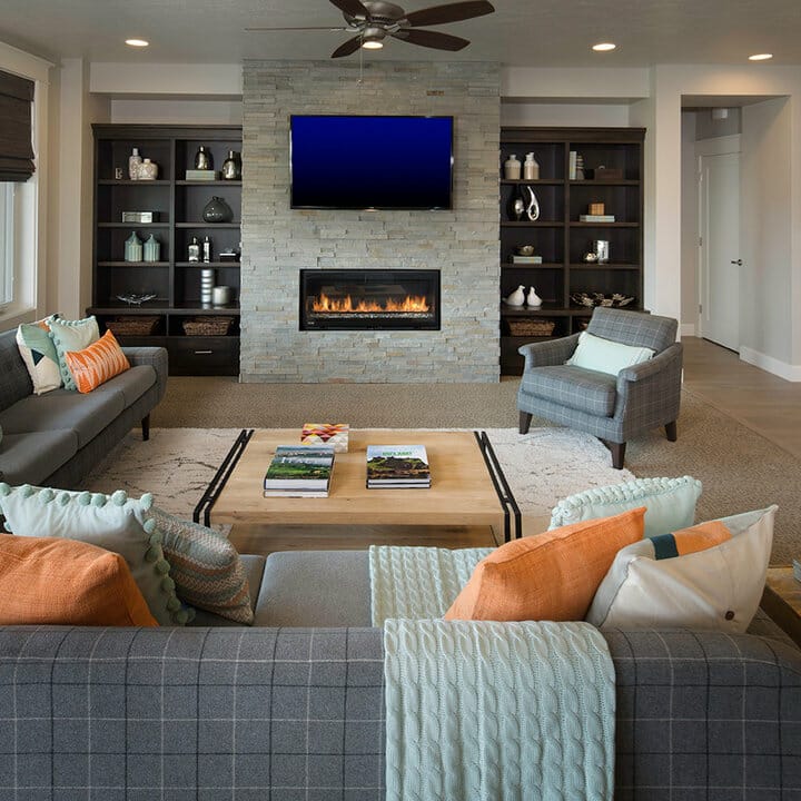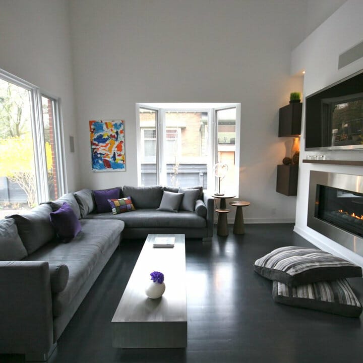 Do you love streamlined gray couch living room ideas? If so, duplicate this seating configuration. Two light gray couches face each other. Also, they provide an excellent foundation for different fabrics and textures.