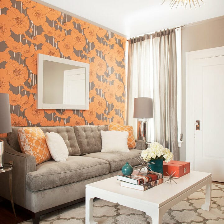 The warm gray velvet couch accommodates bright orange and white pillows. Meanwhile, the floral wallpaper does not only offer interest but also epitomizes cohesion.