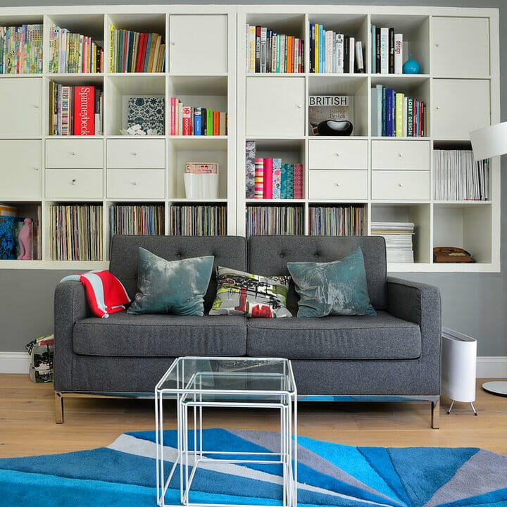 When decorating with a dark gray couch, try introducing contrast. The deep gray sofa meets the white cube bookshelf, base molding, and sleek table drastically.