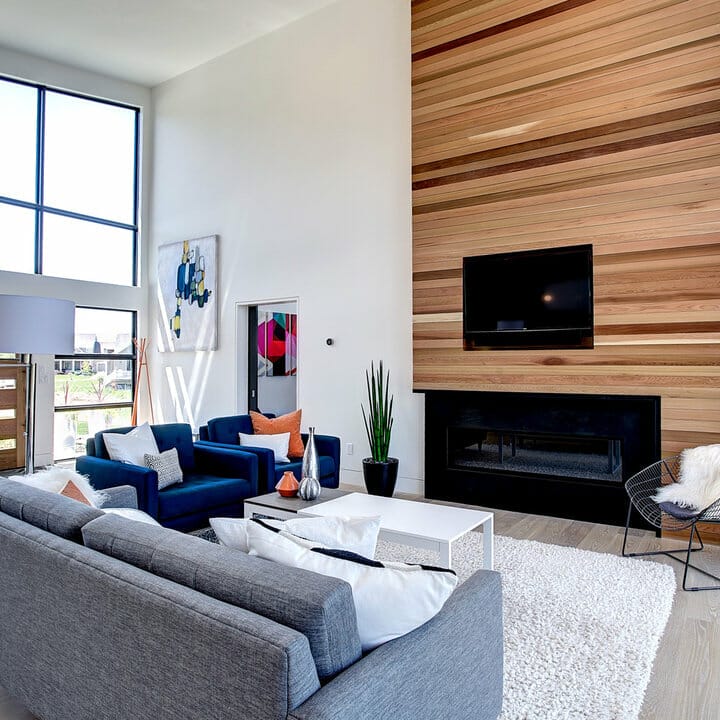 Homeowners varied the intensities of neutrals to give the scheme some depth. The light gray couch faces the fireplace while representing a mid-century modern vibe. However, it can harmonize with a contemporary armchair that comes in warm gray.