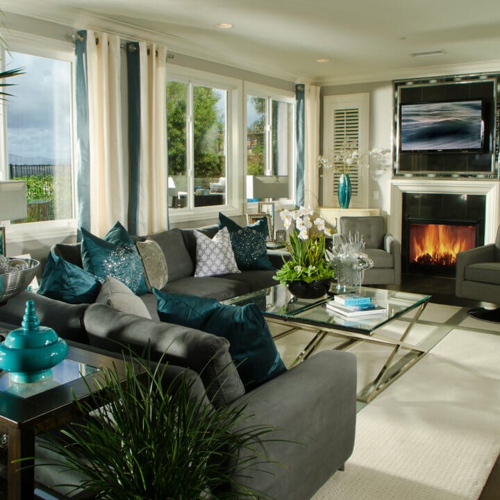 Exquisite teal pillows spiff up the dark gray sectional couch. Furthermore, various turquoise and green adornments accompany them.